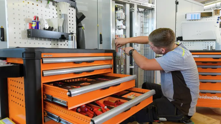 Weidmüller's tool chests are ideal for standardising all workstations, as their internal structure can be set up identically. Maximum flexibility was achieved in the individual drawers. Thanks to the internal, three-part foam inserts, the drawers can be laid out according to the specific application. Each item in the workshop tool chest has its own fixed position in the foam insert cut-outs. Standard tools are positioned directly within reach, and tools that are often used together are positioned alongside each other. This well-thought-out arrangement alone reduces the time spent searching for, reaching for, tidying and checking tools by up to ten per cent. Each inlay is individually adapted to the customer, which makes it unique. The individual inlays can be replaced and combined with each other. This means they can adapt to the specific workflow in the particular area of application. This aspect also won over K. Schweizer AG. "We planned the layout in the tool chest ourselves, in a way that allows us to get the best out of it for our applications", explains Carballo. "All the other tool chests were then set up identically, so that later on, tool worker A can also work with colleague B's tool chest and immediately knows where the right tool is located."