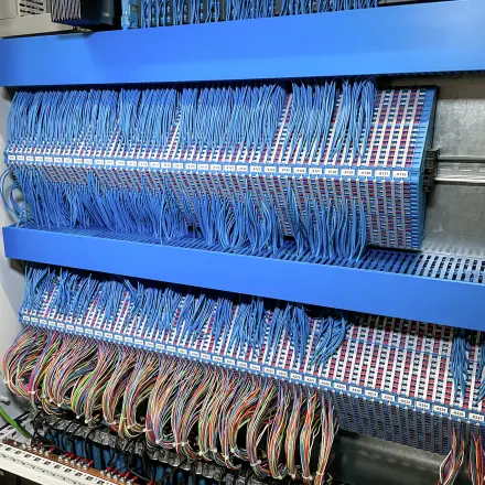 The old substation consisted of many cabinets full of cables and connection points. The goal of the revisions was to achieve a high level of wiring density, in which the signals could be connected in series in an easy to understand way.
