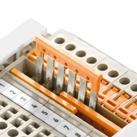 The WMF terminal block has three cross-connection channels; they are a very flexible solutions for bundling and looping through of potentials. The standard ZQV cross-connections can be used to join both the neutral wire and also a shielded potential voltage across a large number of poles.